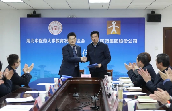 武汉人福医疗管理有限公司董事长曾志敏与湖北中医药大学副校长、教育发展基金会副理事长黄必胜签订捐赠协议